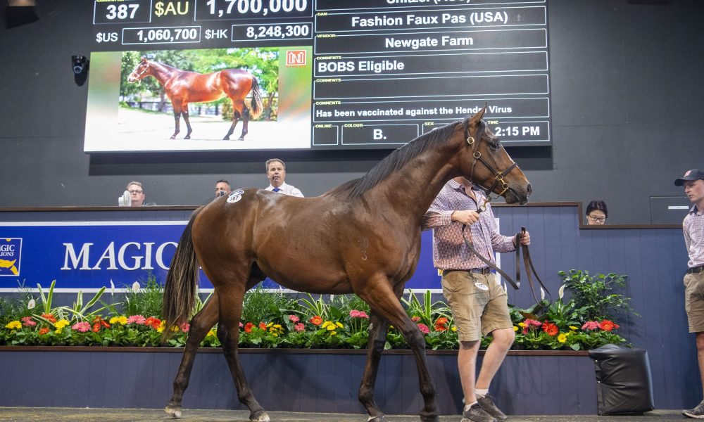 Tom Magnier, standing at the back of the ring, made his first purchase of the week when he paid Newgate Farm $1.7 million for a colt out of the dual US Listed winner Fashion Faux Pas (Flatter), who was bought by James Harron and Byron Rogers on behalf of Belinda Bateman for US$310,000 at the Keeneland Breeding Stock Sale in 2020.