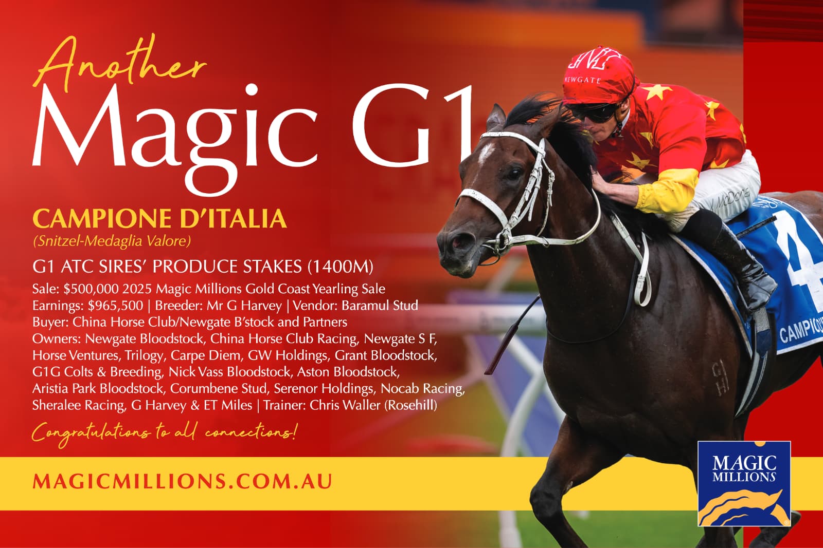 Freedman has enjoyed outstanding success since going it alone following his split from brother Richard in 2022. His highlights have included winning last year’s Golden Slipper with Marhoona (Snitzel), who claimed a second elite victory last month in Rosehill’s The Galaxy (Gr 1, 1100m), and taking the 2024 ATC Sires’ Produce Stakes (Gr 1, 1400m) with Manaal (Tassort).