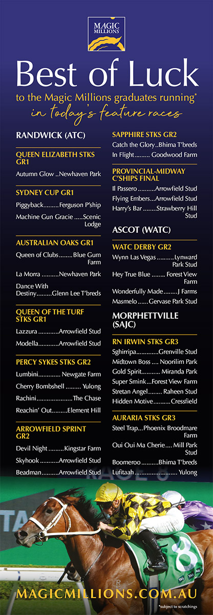 Arrowfield has several Group 1-winning chances before the Queen Elizabeth starting with After Summer, who is another daughter of The Autumn Sun, in the Australian Oaks (Gr 1, 2400m). She was beaten but not disgraced last time out when her jockey Billy Egan protested unsuccessfully after the Vinery Stud Stakes (Gr 1, 2000m) at Rosehill.