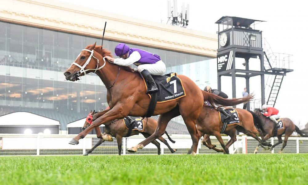 The splattering of Caulfield mud did nothing to taint the clinking of glasses emblazoned on the silks of yesterday’s Thousand Guineas (Gr 1, 1600m) winner Madame Pommery (3 f No Nay Never – Cancel by Exceed Excel), as her all-lady syndicate celebrated a champagne ride from champion jockey James McDonald to claim Classic success.