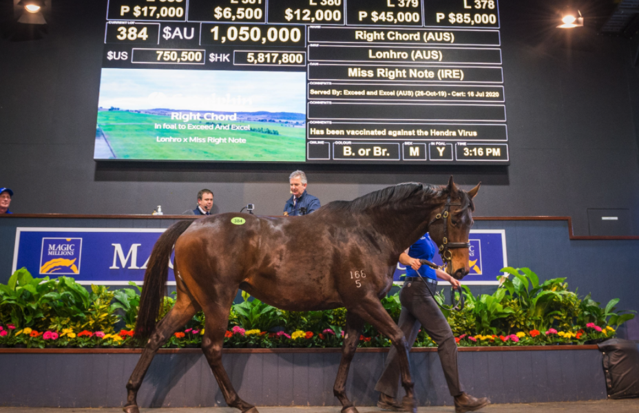 Right Chord (Lonhro) added her name to an already star-studded list of million-dollar lots behind the record-setting Sunlight (Zoustar), who made $4.2 million, the $2.75 million mare Unforgotten (Fastnet Rock), Champagne Cuddles (Not A Single Doubt ($2 million) and Invincibella (I Am Invincible) ($1.3 million).