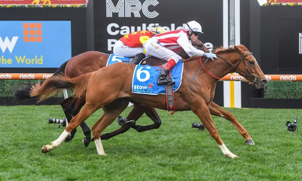 The impressive Giga Kick (3 g Scissor Kick – Rekindled Applause by Royal Applause) laid down a marker as a prominent spring contender when running out a ready winner of the Vain Stakes (Gr 3, 1100m) at Caulfield yesterday for trainer Clayton Douglas, stretching his unbeaten career to three wins, on a day when recently-turned three-year-olds